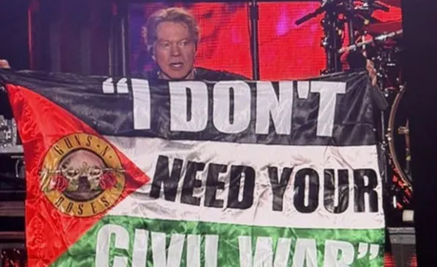 Durante la interpretación de “Civil War”, Axl Rose tomó una bandera de Palestina que le extendieron desde el público. La bandera llevaba parte de la letra de la canción impresa en sus franjas horizontales: “No necesito tu guerra civil”. También incluía el logo de Guns N’ Roses en el triángulo lateral.