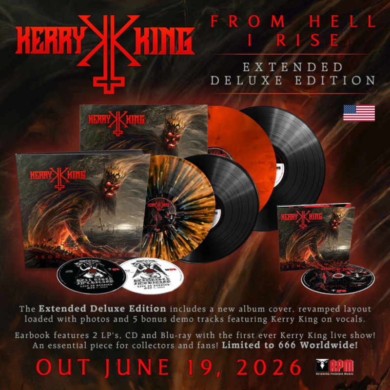KERRY KING ofrece aún más a sus fans. El icónico compositor y guitarrista de SLAYER lanzará una Edición Deluxe Extendida de su aclamado álbum debut en solitario, From Hell I Rise, a través de Reigning Phoenix Music el 19 de junio de 2026. Esta edición incluye cinco demos inéditas y nuevos elementos visuales, como la portada diseñada por James Bousema y un diseño renovado con fotos adicionales. Las demos ofrecen una perspectiva única del proceso creativo de King, con grabaciones vocales de prueba del propio Kerry. Un trabajo que lleva realizando durante años y que nunca se había escuchado fuera del estudio, hasta ahora.