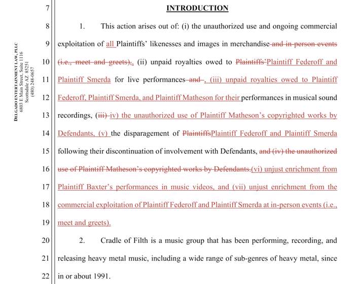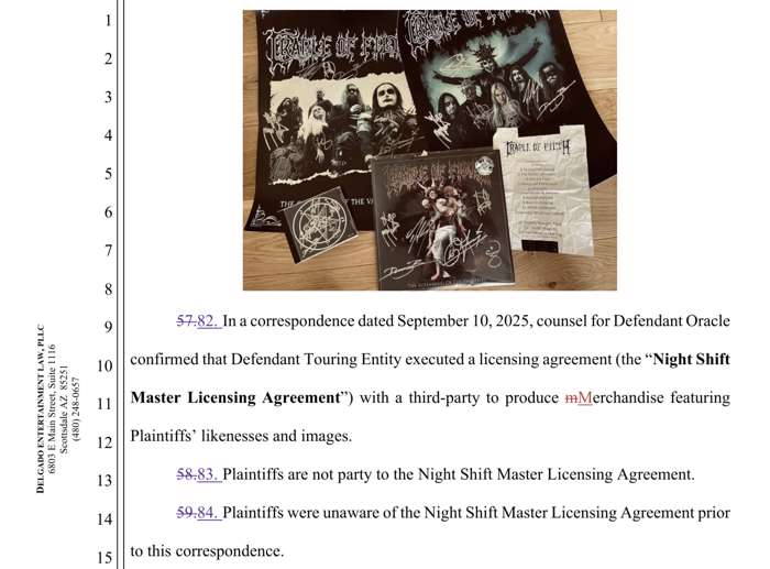 Seis ex integrantes de Cradle of Filth han unido fuerzas para presentar una demanda colectiva en el Tribunal de Distrito de Estados Unidos para el Distrito de Arizona. Los afectados, que incluyen a Zoë Federoff, Marek “Ashok” Smerda, Lindsay Schoolcraft (conocida también como Lindsay Matheson), Richard Shaw, Paul Allender y Sasha Baxter, apuntan directamente a Cradle of Filth LLP, Cradle of Filth Touring Ltd., el vocalista principal Dani Filth y la empresa de gestión Oracle Management.