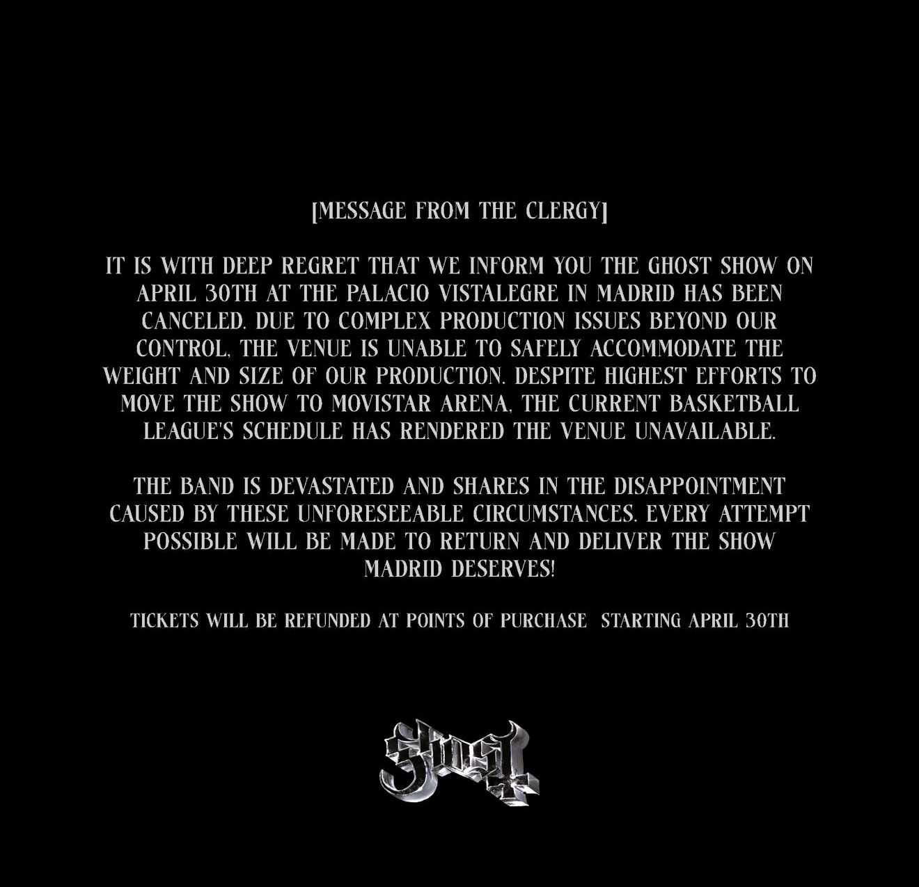 “Lamentamos profundamente informaros de que el concierto de GHOST del 30 de abril en el Palacio Vistalegre de Madrid ha sido cancelado. Debido a complejos problemas de producción que escapan a nuestro control, el recinto es incapaz de albergar con seguridad el peso y tamaño de nuestra producción. A pesar de los grandes esfuerzos para trasladar el espectáculo al Movistar Arena, el calendario actual de la liga de baloncesto ha hecho que el lugar no esté disponible.