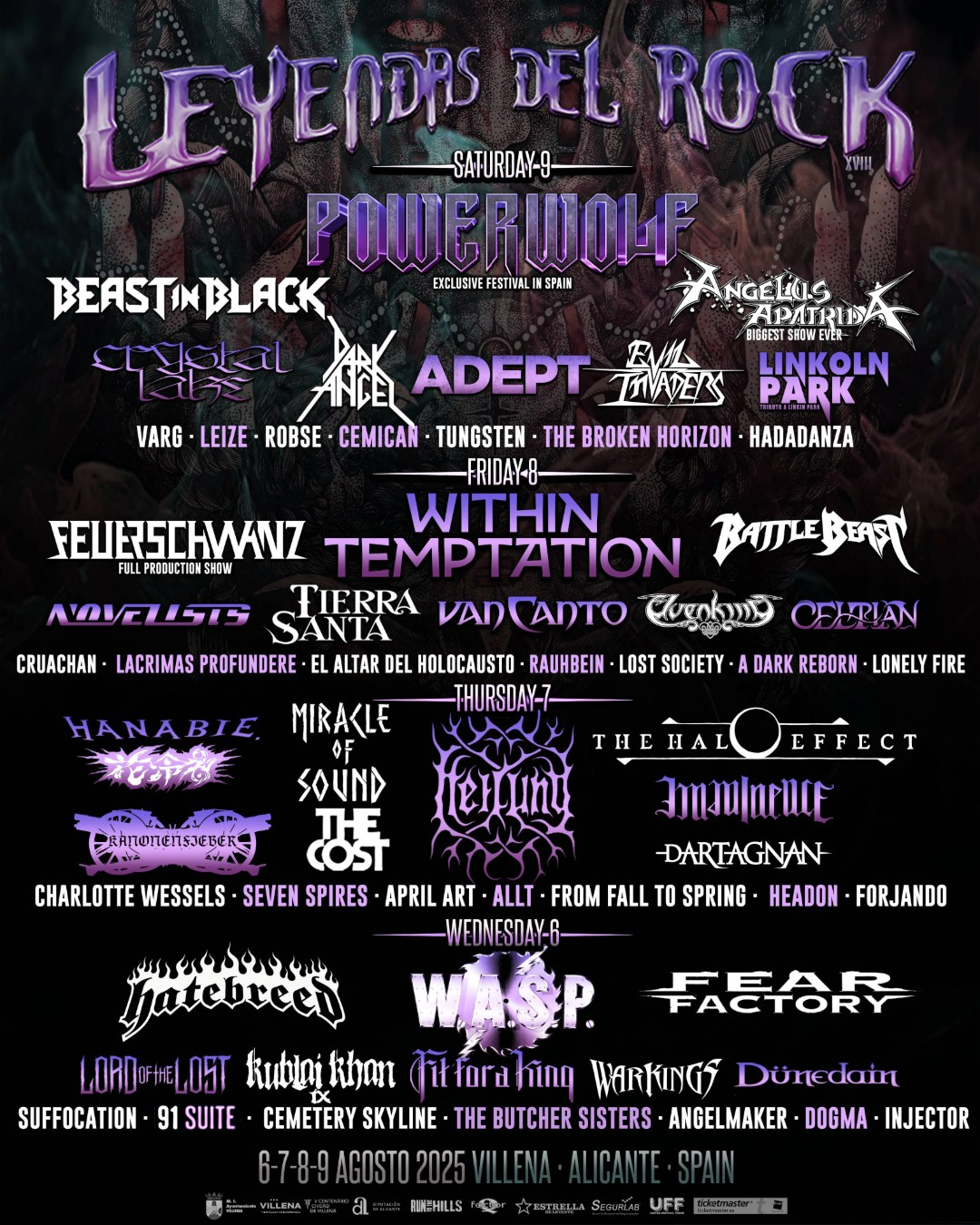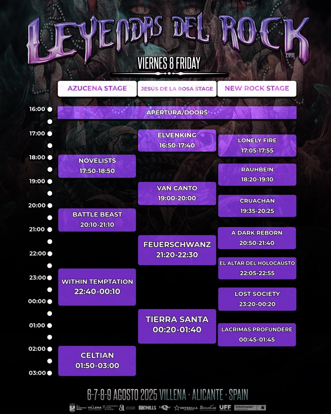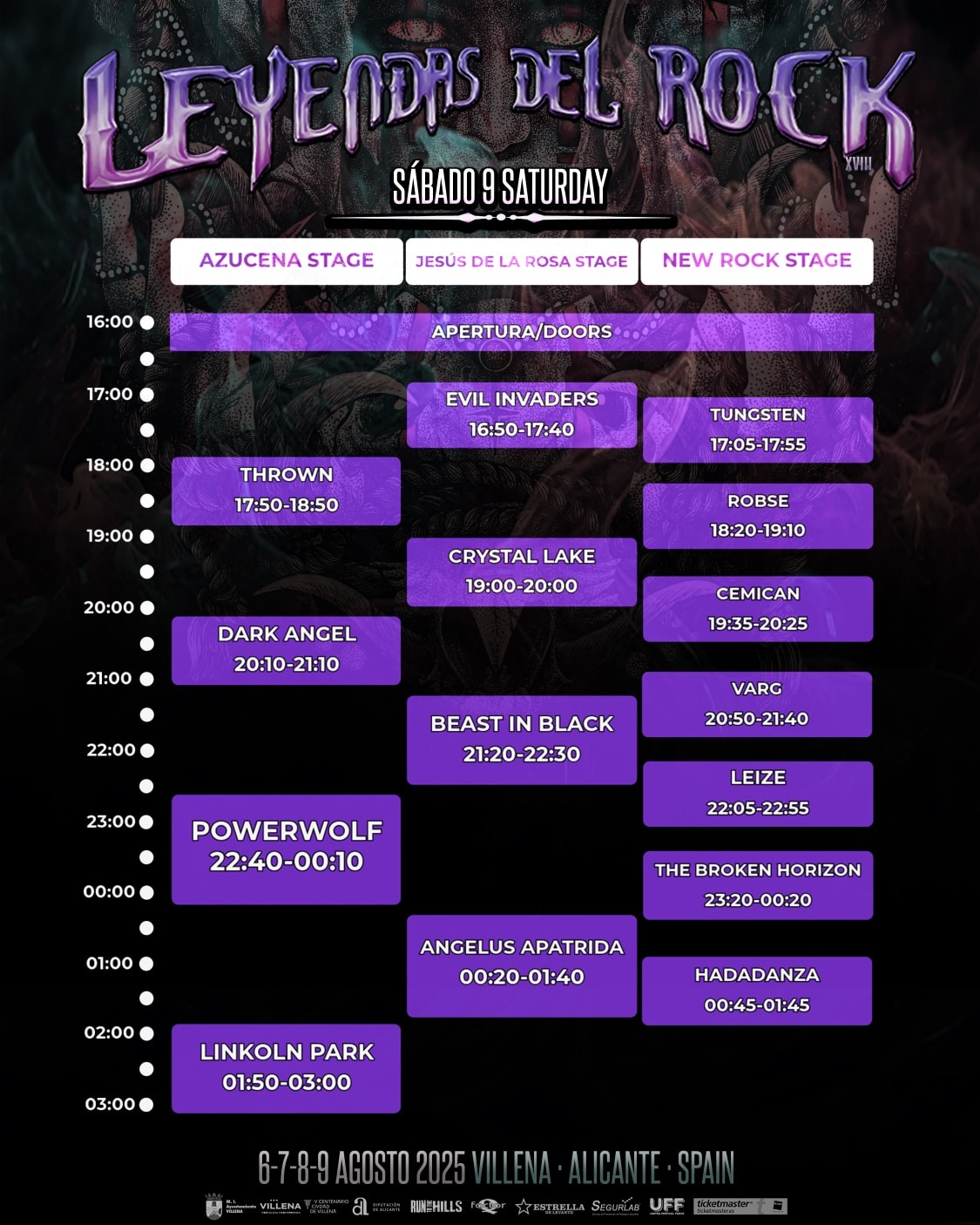 A poco más de tres semanas para disfrutar de uno de los Festivales más longevos de España con la decimoctava edición del LEYENDAS DEL ROCK, ya están disponibles los horarios para ver actuar a las 60 bandas tanto del panorama nacional como internacional que pasarán por los tres escenarios del Polideportivo Municipal de Villena (Alicante) del miércoles 6 al sábado 8 de agosto,