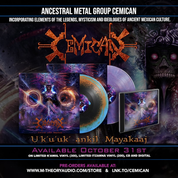 La portada de “U k ‘u’ uk’ankil Mayakaaj”, creada y diseñada por Tlipoca. Representa la gran creación del universo maya y los elementos de la vida (agua, fuego, viento y tierra) por el gran supremo Itzamnaaj… erigiendo el gran Templo de Kukulkán para la adoración del pueblo maya. Entre la inmensidad del océano, emerge el primer hombre sagrado, creando el caos interdimensional entre estelas y nebulosas. En la mano derecha del gran Itzamnaaj, nace un agujero negro, que representa la gran oscuridad infinita. En su mano izquierda, un torbellino de fuego representa el comienzo de la luz o el amanecer de la vida y el inicio de la misma. En la parte superior, entre una avalancha de meteoros y la tierra estelar, se dibujan dos rostros: el de una mujer o madre, que da vida o da a luz a los humanos; y en el otro lado, el rostro de la muerte, que representa el ciclo del hombre terrenal en su paso por esta vida. Aclamada por Revolver como “una antigua respuesta mexicana a The Hu o Heilung”, la música de CEMICAN —cuyo nombre significa “la dualidad de la vida y la muerte” en náhuatl, la lengua azteca (hablada por dos millones de personas en el centro de México)— incorpora elementos de las leyendas, el misticismo y las ideologías de la antigua cultura mexicana, el grupo combina la instrumentación moderna de una banda de metal con instrumentos tradicionales prehispánicos.