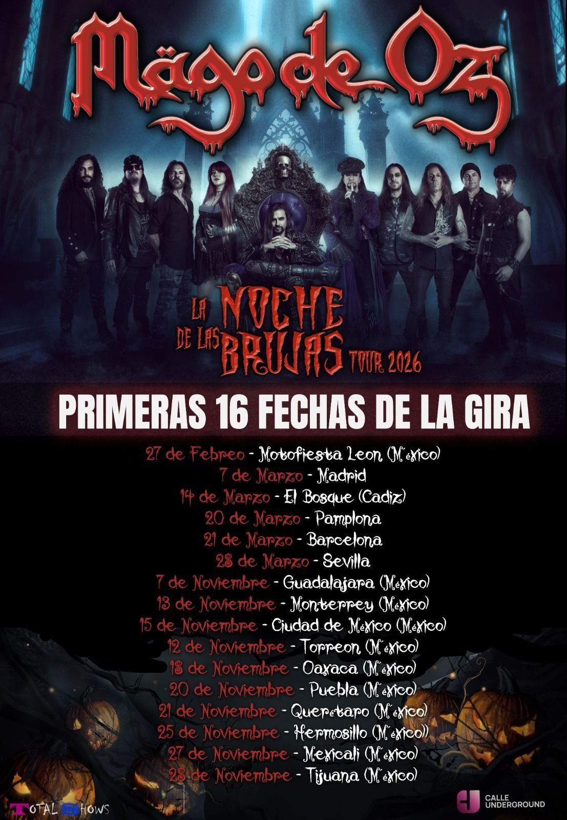 MÄGO DE OZ presentará su último disco “Malicia: La noche de las brujas”, sin olvidar sus grandes éxitos, en el tour que arrancará el próximo 27 de febrero en México. De momento las fechas confirmadas pasan por México y España. Las bandas invitadas son TRANSILVÄNIA en Madrid y LEYENDÄRIAN en Barcelona . Además de estas localizaciones, MÄGO DE OZ actuará en la sala Totem de Pamplona y la sala Custom de Sevilla, así como en el FESTIVAL ROCK OCHENTERO de El Bosque (Cádiz) junto a otras bandas.