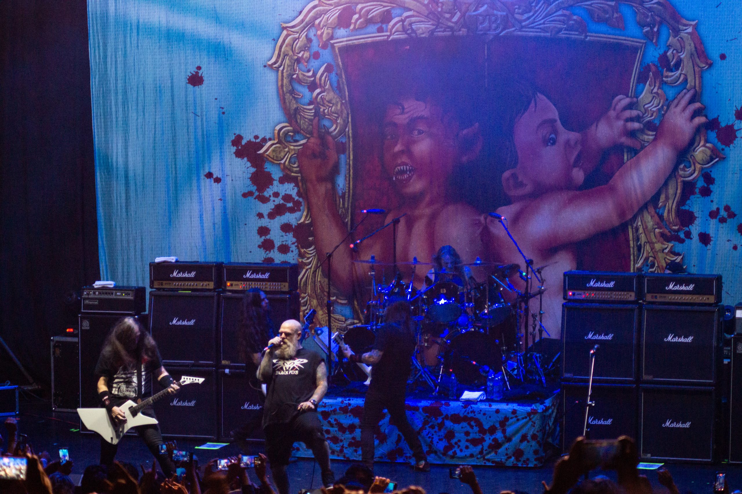 Alrededor de la hora y cuarenta, el velo cayó con “Strike of the Beast”, el remate del debut que Exodus ejecutó como un decreto inexorable: un zarpazo que dejó el piso convulsionando, el pit deshaciéndose en un lodazal de fatiga gozosa. Nadie abandonó indemne; fue un vendaval sónico que arrastró impurezas internas, tensiones urbanas y esa mugre que la rutina acumuló como herrumbre. Los músicos se entretuvieron al borde, Holt repartiendo púas como proyectiles, Hunting soltando baquetas a manos codiciosas, Dukes agradeciendo al público. De fondo, el sistema mantuvo el ritmo con “Walk” de Pantera, ese pisotón texano que martilleó “¡I’m walking!” como un reto al alba que asomó. Las luces brutales se prendieron, exponiendo el terreno devastado –vasos de cerveza, camisetas desgarradas, expresiones de supervivientes–, y entonces, para clavar el sello en el vacío, “Raining Blood” surgió entera de los altavoces. Lo de Exodus fue uno de los mejores conciertos del año.