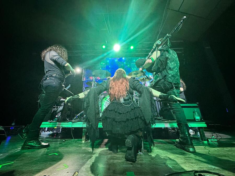 La intro comenzaba a sonar. Los músicos, todos vestidos de negro, se colocaban en el escenario, David a la batería, el bajista Miguel y el guitarrista Sergio en los extremos, y más centrados el violinista Txus y el flautista Diego. En el centro, Xana iba a protagonizar el espacio con su melena de fuego y su potente voz. “La profecía” se ofreció como aperitivo, enlazando rápidamente con “Sueños de cristal”, ambas extraídas del último trabajo que da título a la gira. Una vez metidos en el ambiente, CELTIAN llevó a su público a recordar “Solsticio de Driade”, el primer tema que nos trasladaría a su trabajo publicado en 2019. Los instrumentos sonaban claramente, perfectamente nivelados, contribuyendo cada uno a una mezcla equilibrada de folk y metal. Pero no permaneceríamos en esta tierra de hadas mucho tiempo, porque enseguida volvimos al último disco. Xana aprovechó para mostrar el poderío de su voz a capella con el pretexto de que todo el público pudiera ensayar los coros. Así, entre todos, ejecutamos “Hasta el final” seguida de “Renacer”.