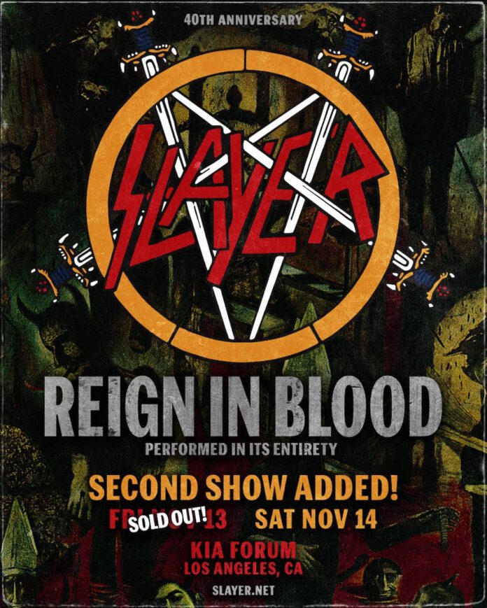 La leyenda del metal extremo Slayer, uno de los pilares indiscutibles del género a nivel mundial, ha agotado todas las entradas para su primer concierto en Los Ángeles, donde celebrarán el 40 aniversario de su histórico álbum “Reign in Blood”. La demanda fue tan abrumadora que la banda anunció una segunda fecha en el mismo escenario, el Kia Forum, para el sábado 14 de noviembre, apenas un día después del primer show.
