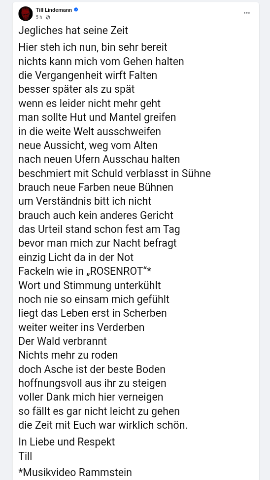 Sin embargo, es importante destacar que Lindemann no ha ofrecido detalles concretos sobre sus planes futuros o su relación con Rammstein. Aunque sus palabras pueden sugerir una despedida, no hay una confirmación oficial de su salida de la banda en este momento.