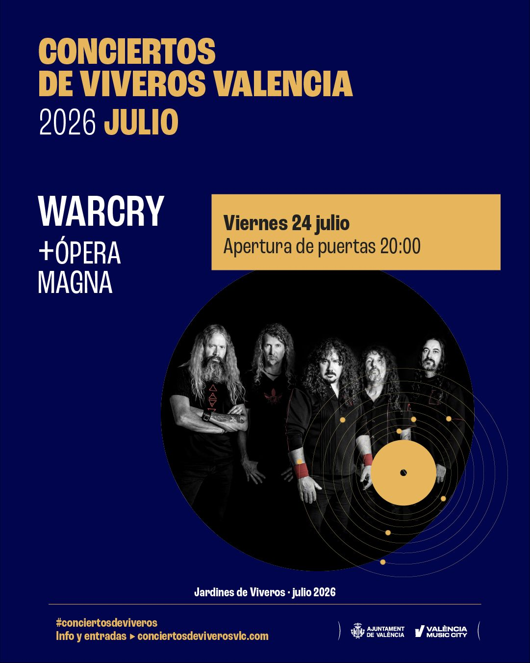 WARCRY llega a Conciertos de Viveros 2026 para ofrecer una noche dedicada al heavy metal, acompañado por OPERA MAGNA como banda invitada. Una cita imprescindible para los amantes del rock más potente.Con una sólida trayectoria y una base de seguidores muy fiel, WARCRY es una de las bandas más representativas del metal en español, destacando por su fuerza en directo y la conexión con su público. El 24 de julio, los Jardines de Viveros vibrarán con guitarras, himnos coreados y una descarga de energía que promete ser uno de los conciertos más intensos del ciclo. Un concierto pensado para vivir el metal en estado puro, en un entorno único como los Conciertos de Viveros.